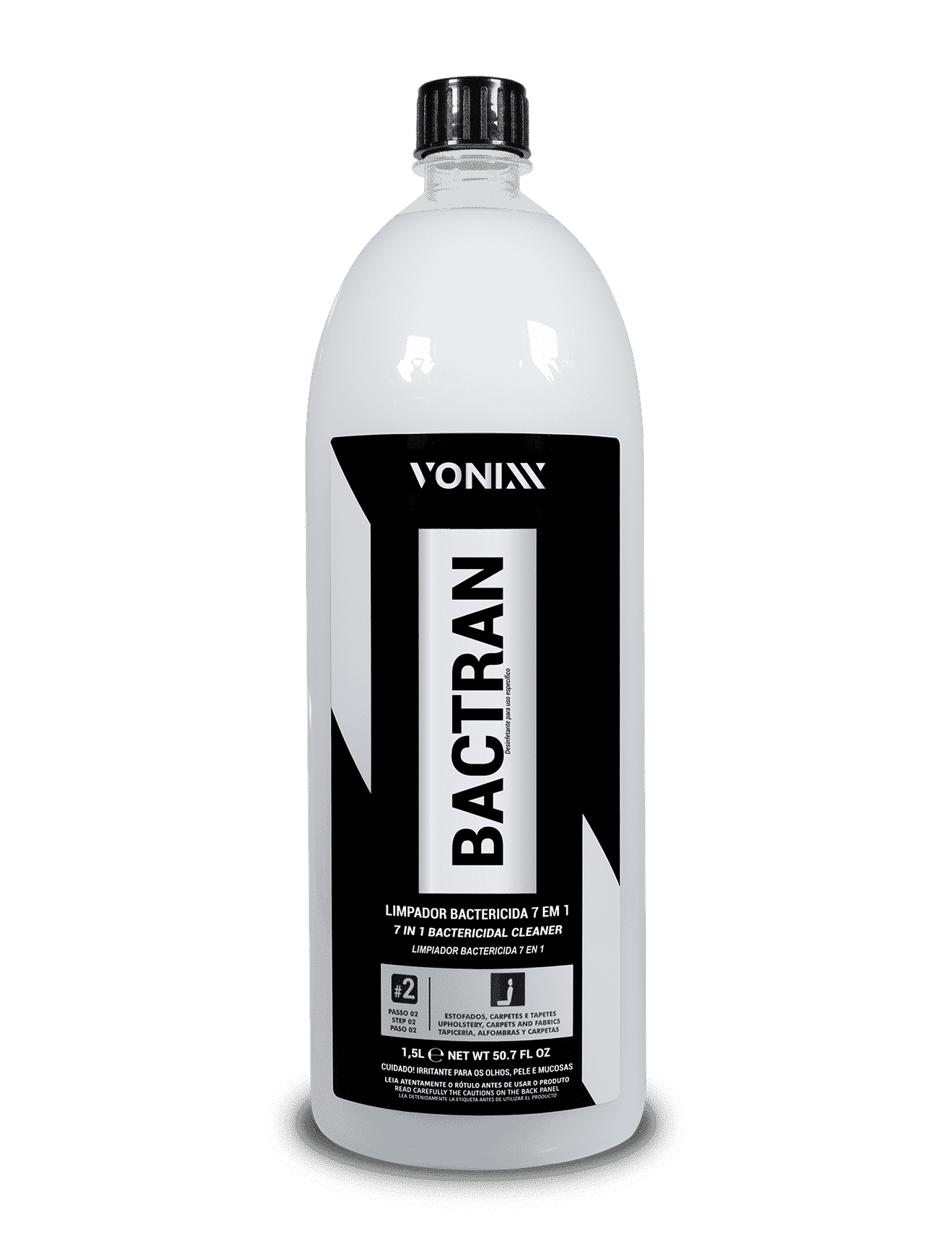 Bactran é um limpador bactericida ultra concentrado de alta performance e baixa espumação, desenvolvido para limpeza profissional de estofados, carpetes e tapetes. Seu uso é indicado com extratoras.  Sua fórmula contém tensoativos especiais que agem em sinergia com o peróxido de hidrogênio e remove facilmente os mais diversos tipos de sujeira, em especial manchas de sangue, suco, café e bolores, além de eliminar fungos e bactérias.