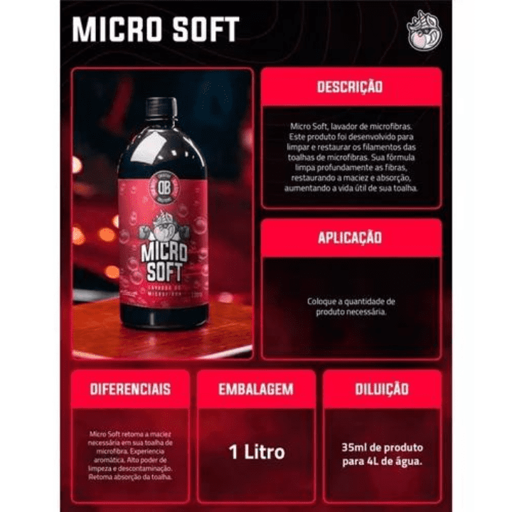 Micro Soft é um produto desenvolvido para lavagem e condicionamento de panos de microfibra e aplicadores. Sua formula limpa profundamente as fibras restaurando macies e absorção.
