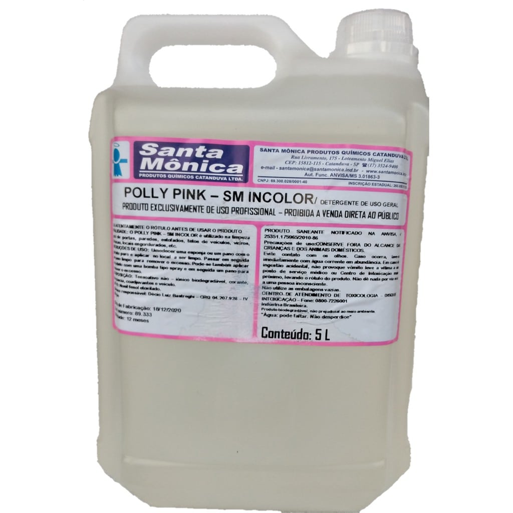 Polly Pink – SM Incolor, é um produto liquido transparente ou rosa, composto por solventes especiais com tensoativos, alcóois, agentes anti-espumantes e desengordurantes.
