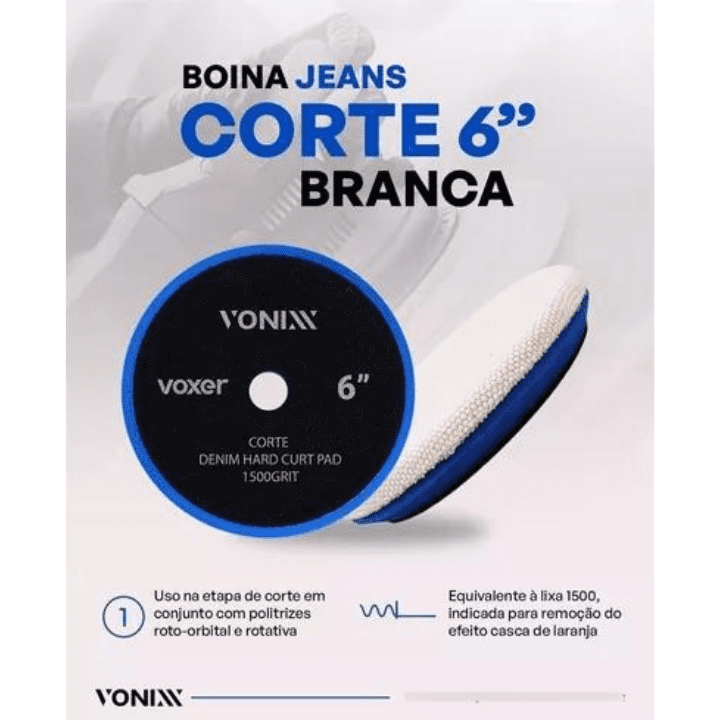 A BOINA JEANS VOXER BRANCA CORTE é indicada para a primeira etapa do polimento automotivo. Utilizada na etapa de corte em conjunto com politriz roto-orbital ou rotativa, é capaz de remover cascas de laranja e defeitos profundos correspondentes a lixa de 1500 grit.